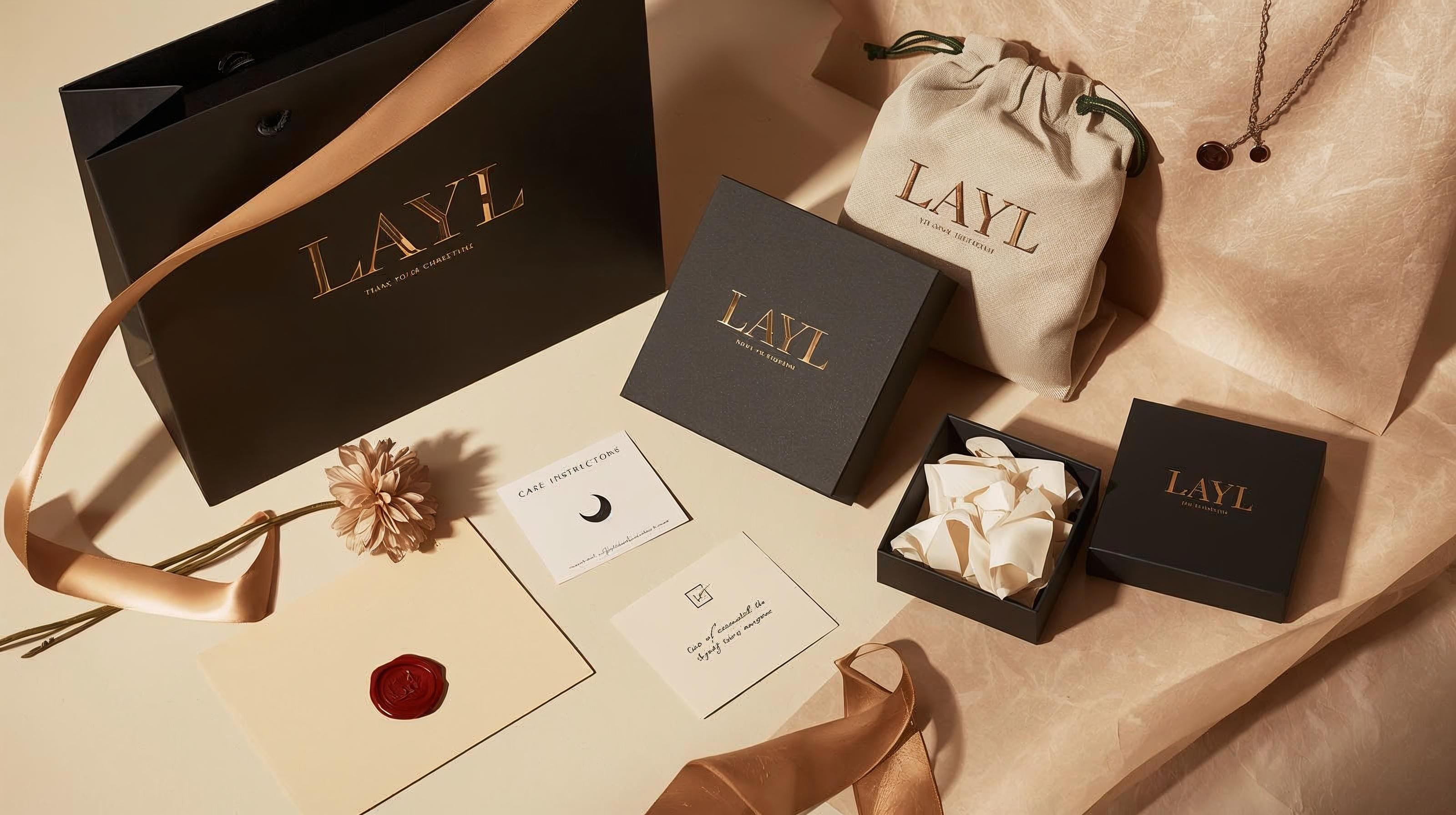 Matte black, gold-stamped packaging that protects your jewelry and makes every gift look elegant. Strong, clean, and professional.