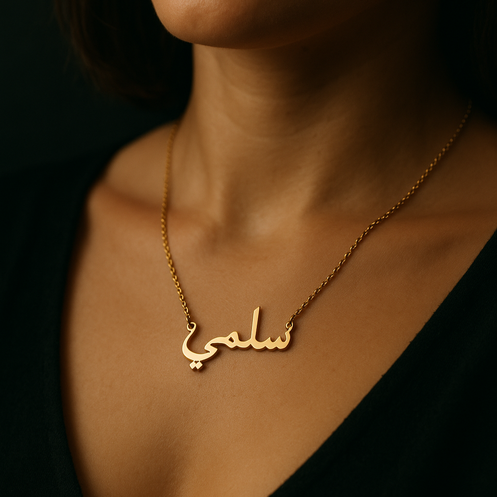 A unique gold necklace custom-made with your chosen name in authentic Arabic calligraphy.